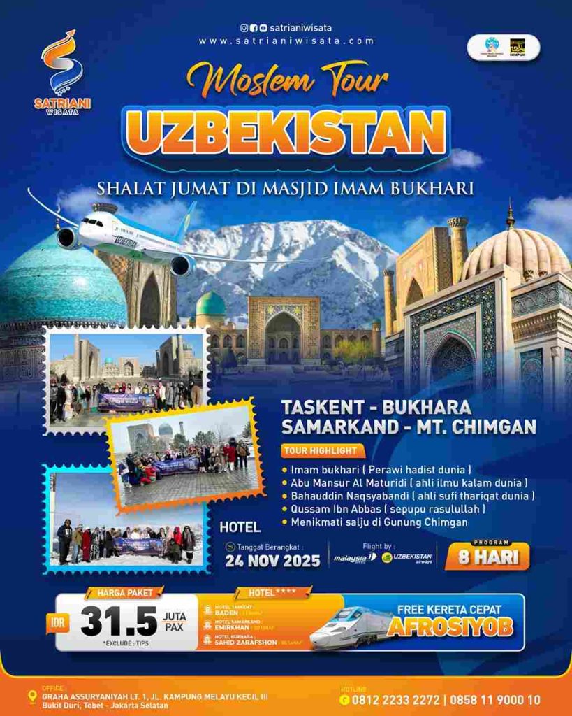 Muslim Tour Uzbekistan yang memberikan pengalaman baru dimana menggabungkan ziarah Islam ketempat-tempat bersejarah Islam dan juga melakukan wisata ke destinasi-destinasi yang menarik bersama Satriani Wisata.