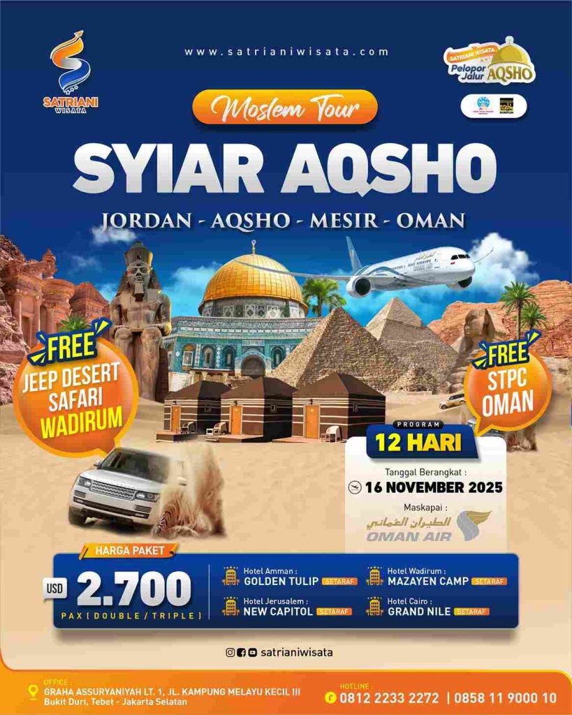 Tour Masjidil Aqsa bersama Satriani Wisata, sang pelopor jalur Al Aqsa yang konsisten sampai sekarang membawa jamaah untuk mengunjungi dan memakmurkan masjidil Aqsa sejak tahun 1994. Dengan upaya memakmurkan masjidil aqsa kami mengajak umat muslim indonesia untuk bersama mengunjungi Baitul Maqdis / Masjidil Aqsa yang ada di Palestina, kaena dengan kunjungan kita bisa membantu lebih banyak warga palestina dengan dukungan moril dan materiil