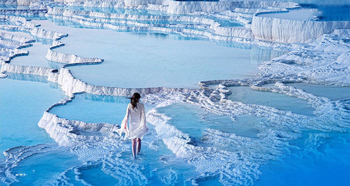 Pamukkale, yang berarti “benteng kapas” dalam bahasa Turki, adalah sebuah situs alam di Provinsi Denizli di Turki barat daya. Kota ini berisi air panas dan travertine, mineral karbonat yang ditinggalkan oleh air yang mengalir. Ini terletak di wilayah Turki Aegea dalam, di lembah Sungai Menderes, yang memiliki iklim sedang untuk sebagian tahun.